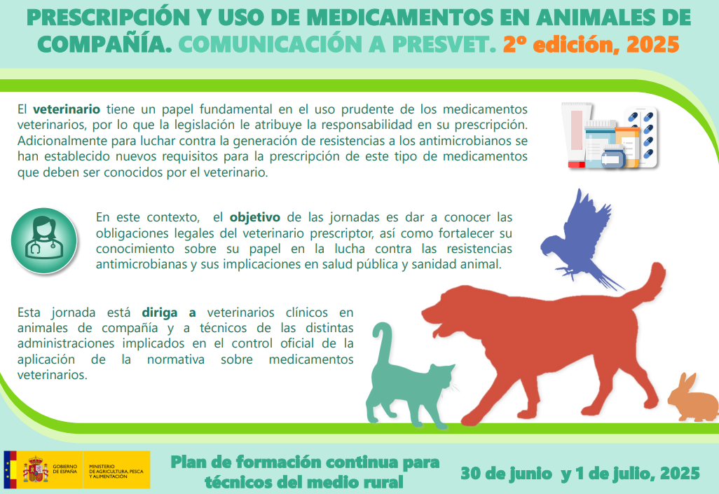 La Subdirección General de Sanidad e Higiene Animal y Trazabilidad del Ministerio de Agricultura ha programado la segunda edición del curso de formación para veterinarios y técnicos de control de las administraciones, dentro del plan de formación continua para técnicos del medio rural. El curso está enfocado en la prescripción y uso de medicamentos veterinarios en animales de compañía.